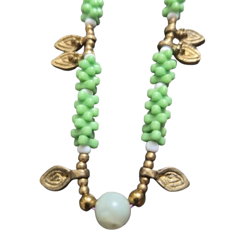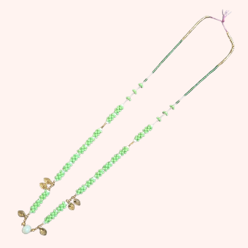 Die handgefertigte Halskette aus Glasperlen besticht durch das Zusammenspiel von Farben, Materialien und den goldfarbenen Anhängern im orientalischen Stil. Diverse enthaltene Vintage-Schmuckteile verleihen dem gesamten Schmuckstück eine einzigartige Geschichte und eine subtile Nostalgie, der jedem Look einen Hauch von Exotik und Charakter verleihen.