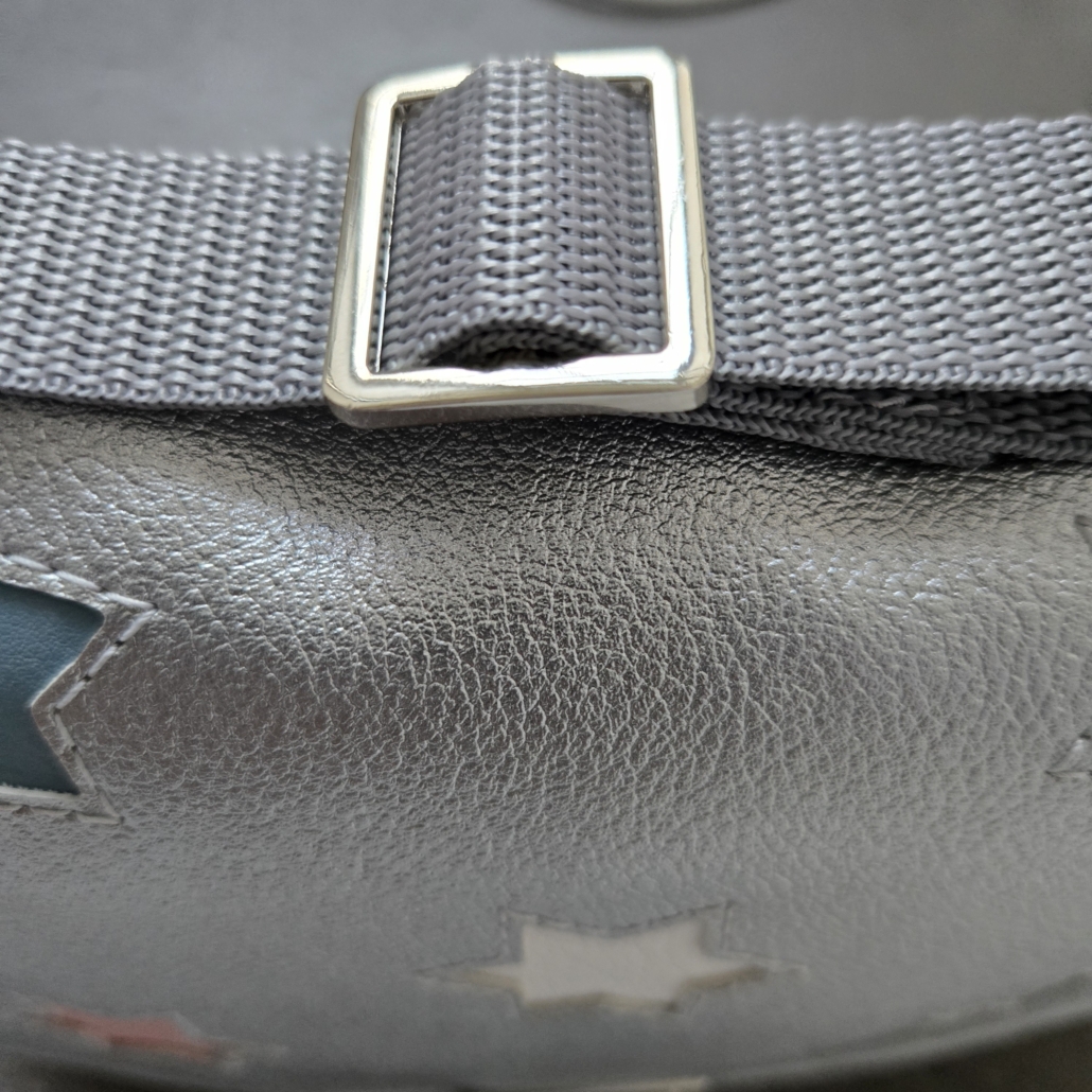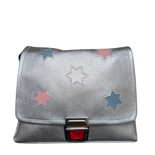 Ein Kindertraum wird wahr! Kindergartentasche aus hochwertigem, strapazierfähigem silbernem Kunstleder mit bunten hinterlegten Sternen. Die Tasche hat einen reflektierenden Druckverschluss für eine gute Sichtbarkeit in der Dämmerung und einen verstellbaren Schulterträger für einen perfekten, bequemen Sitz .